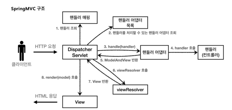 - ModelAndView반환 : 핸들러 어댑터는 핸들러가 반환하는 정보를 ModelAndView로 변화냏서 반환함