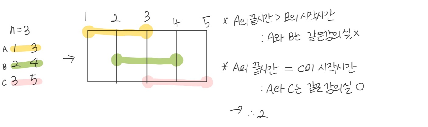 강의실의 개수를 최소화 해야 하므로, 낭비되는 시간을 최소화해야한다. 처음에 시간복잡도 때문에 애를 먹었는데, n이 20만이므로 O(n^2) 가 나오는 알고리즘은 시간초과가 발생할 수 있다. 이중 반복문을 사용하면 시간초과가 나올 확률이 높다는 의미이다.