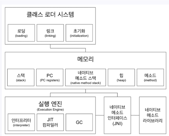 간단하게 이야기 하면 바이트코드를 읽고 메모리에 저장한 후, 클래스 로더 시스템이 끝나면 객체를 생성해 힙 영역에 저장하는 시스템을 이야기 한다.