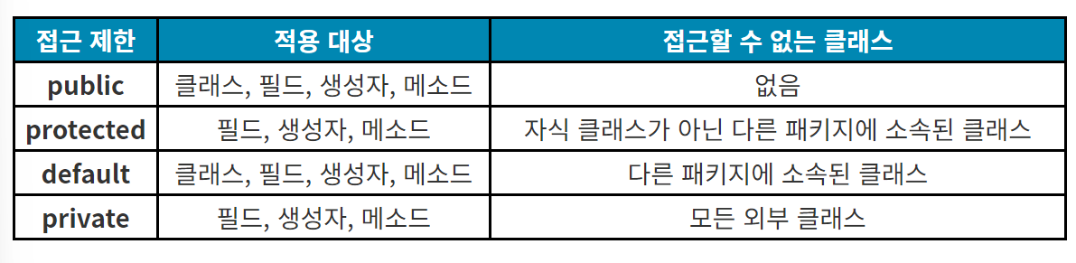 접근제한자는 이름에서도 알 수 있듯이 멤버의 접근을 제한하기 위해 사용한다. 접근제한자는 총 4가지가 있다.