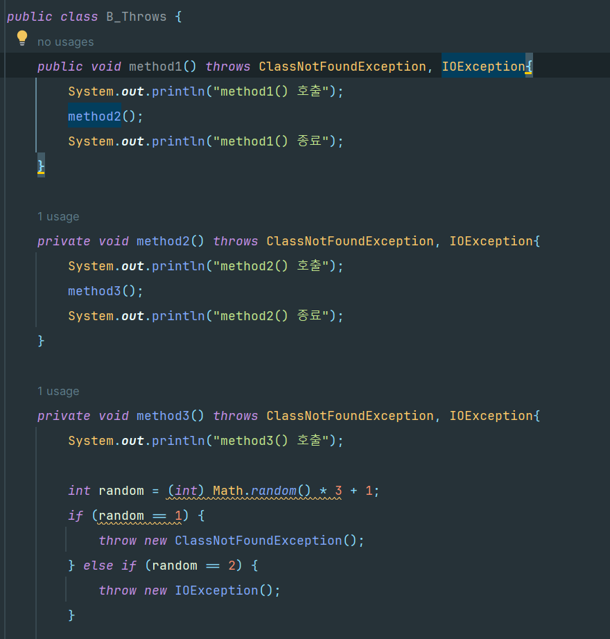 throws 키워드를 사용하면 메소드를 호출한 곳으로 예외를 떠넘길 수 있다.