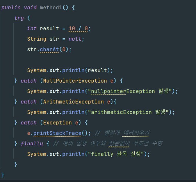 finally블록은 생략이 가능하고, 예외 발생 여부와 상관없이 실행할 내용을 이 블록에 넣는다.
