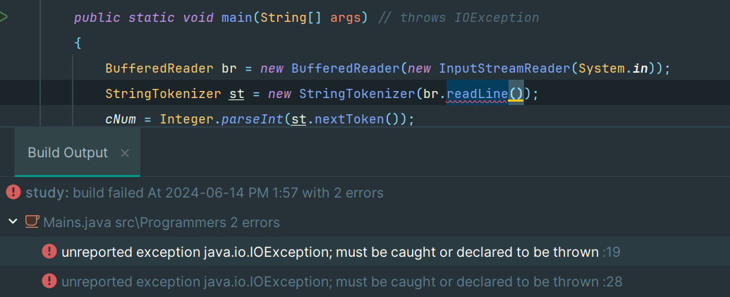 예를 들어 readLine() 메소드를 사용할 때 IOException을 이용해 예외처리를 하지 않으면 에러가 발생한다.