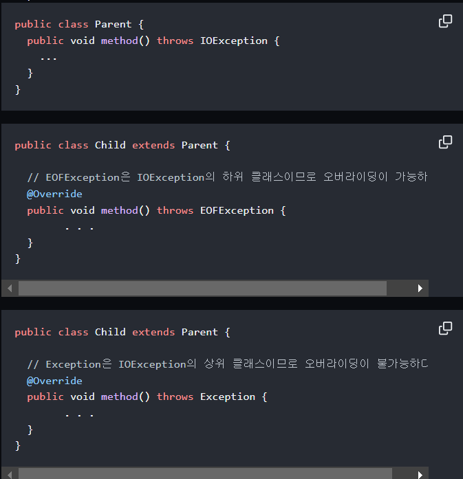 부모 클래스의 메소드를 자식 클래스에서 오버라이딩 할 때, 자식 메소드의 예외처리는 부모의 메소드가 throws 하는 exception과 같거나 하위클래스여야 한다.