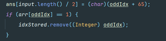 2번 조건때문에 1개 이상 알파벳을 갖는 경우, 순차적으로 리스트에 담아주고 리스트에 들어있는 애들만 마지막에 배열에 넣어주었다. 이때, 홀수인 알파벳이 한개이면서, 그 알파벳의 개수 또한 한 개인 경우 (EX | DDCCA) 에는 한가운데에 넣어주어야 하기 때문에 리스트에서 삭제해주었다.