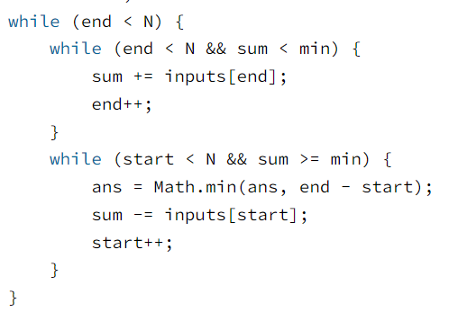 while (end < N && sum < min) {