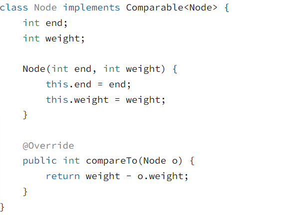 🌟우선순위 큐의 조건을 어떻게 설정해야할지 몰라서 찾아보았는데, 노드 클래스를 생성할 때 Comparable<> 인터페이스를 상속하면 compareTo 메소드를 제공받을 수 있다 ! 여기에서 우선순위 큐의 조건을 설정할 수 있었다.