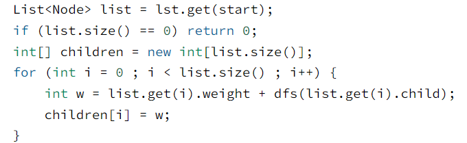 int w = list.get(i).weight + dfs(list.get(i).child);