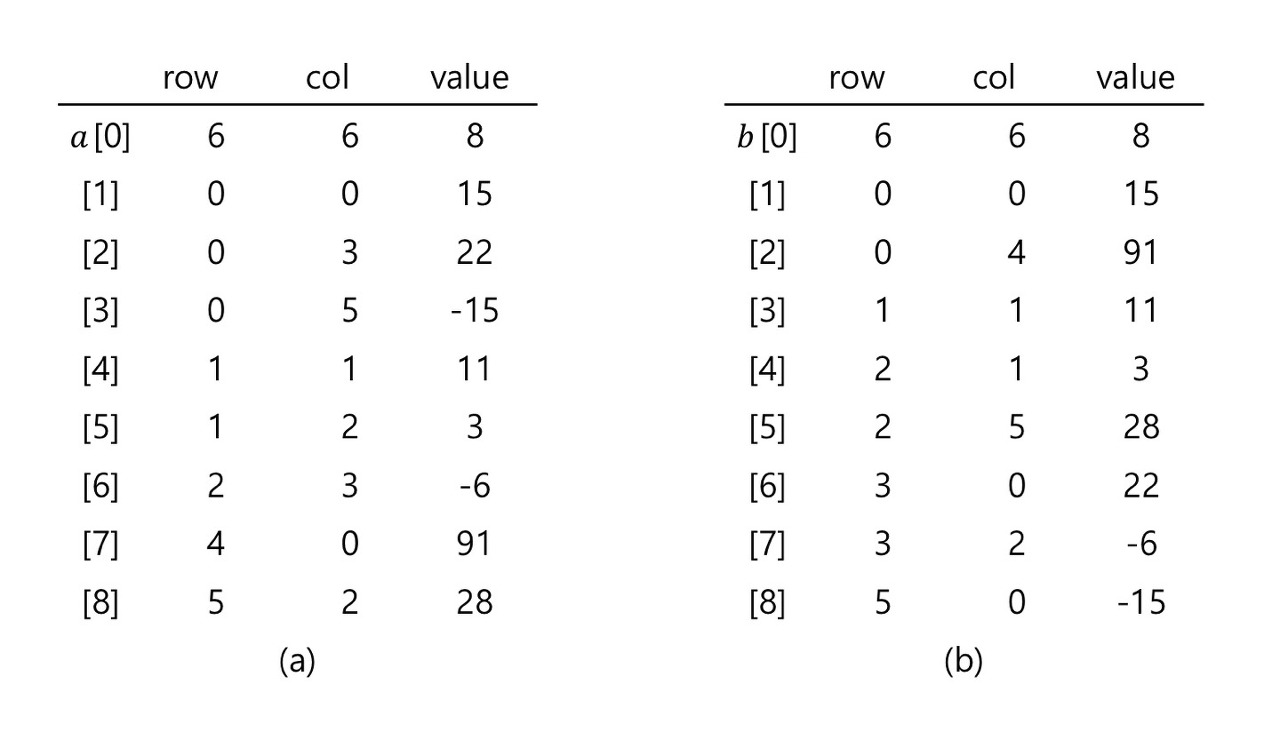 대략 a의 형태로 작성이 가능하다. 값이 0이 아닌 요소의 행과 열 위치와 값을 작성한다. 행과 열 값의 순서를 바꾼것이 b이다.