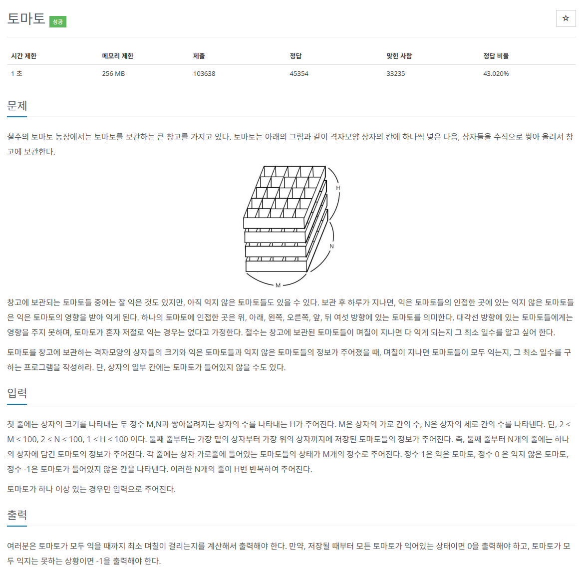 탐색을 마친 후에는 map을 돌면서 -1인 곳이 있으면 방문하지 못한 노드가 있다는 의미이므로 -1을 출력, 없다면 map의 값들 중 가장 큰 값을 출력하도록 했다. 값이 가장 크다는 것은 익기까지 가장 오랜시간이 걸렸다는 의미 즉 마지막으로 익은 토마토라는 의미이다.