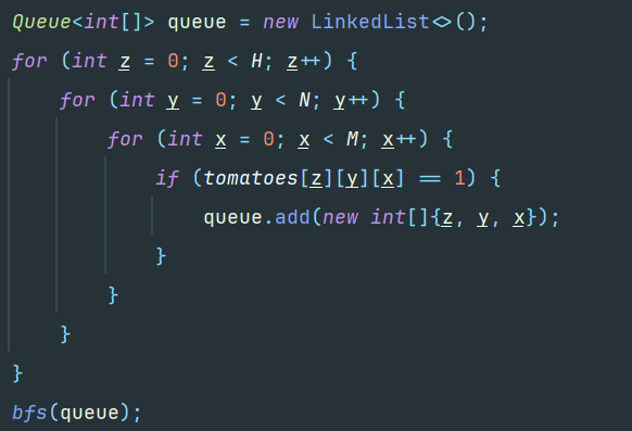 지금까지 했던 2차원 배열 탐색과 달리, 토마토가 들어있는 3차원 상자를 탐색해야 한다. 그래서 삼차원 배열을 생성해주었다. 지금까지 BFS로 그래프탐색을 할 때 방문 여부를 확인하는 isVisit 배열을 생성했었는데, 이 문제는 애초에 전체 토마토를 익게 할 수 있는 "시간" 을 물어보고 있기 때문에, 시간을 넣어줄 배열(map)을 생성해주었다. 토마토 입력이 0인 자리에 초기값을 -1로 설정해주어서 -1이면 방문하지 않은 곳임을 알 수 있도록 했다.