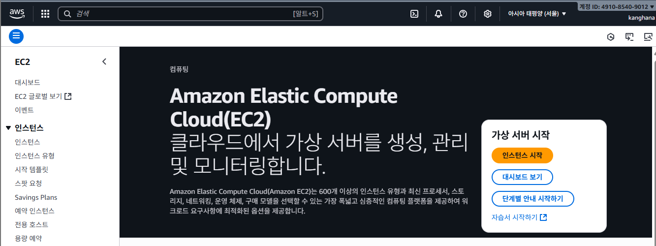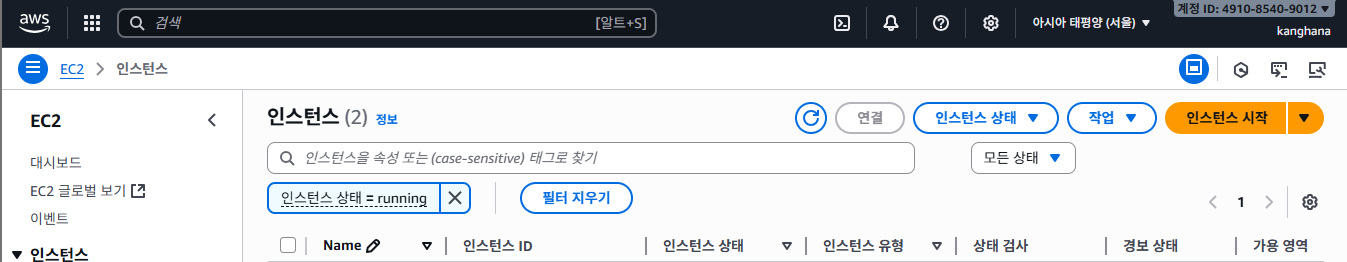 그 후 인스턴스 > 인스턴스 시작 버튼을 눌러준다.