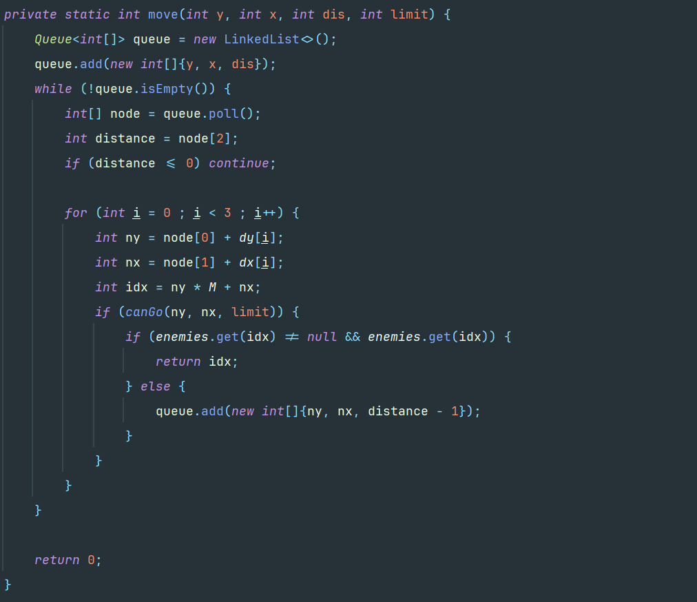 탐색 알고리즘은 bfs를 사용해주었다. 적을 찾은 경우 적의 인덱스를 바로 리턴하고, 적을 못찾으면 계속 탐색한다.