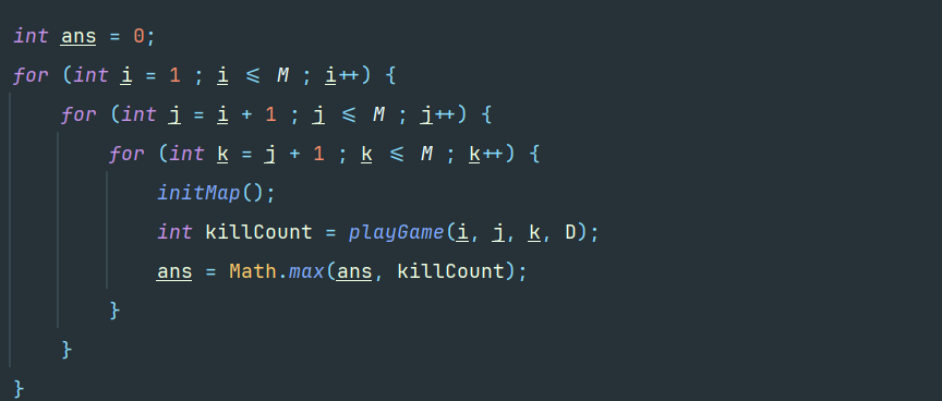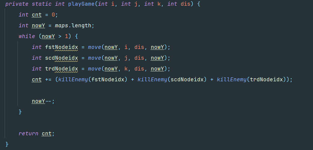 i, j, k는 각 궁수의 x좌표이다. 한 턴이 지날 떄마다 적이 내려오는데, 나는 궁수의 위치를 올려서 궁수보다 y좌표가 작은 경우만 처리해주었다. 각 궁수가 처리해야하는 적의 인덱스를 반환하도록 하여 해당 인덱스가 0보다 큰 경우 (실제 인덱스를 반환한 경우) 실제 처리 (map의 value를 false로 변경) 해주었다.
