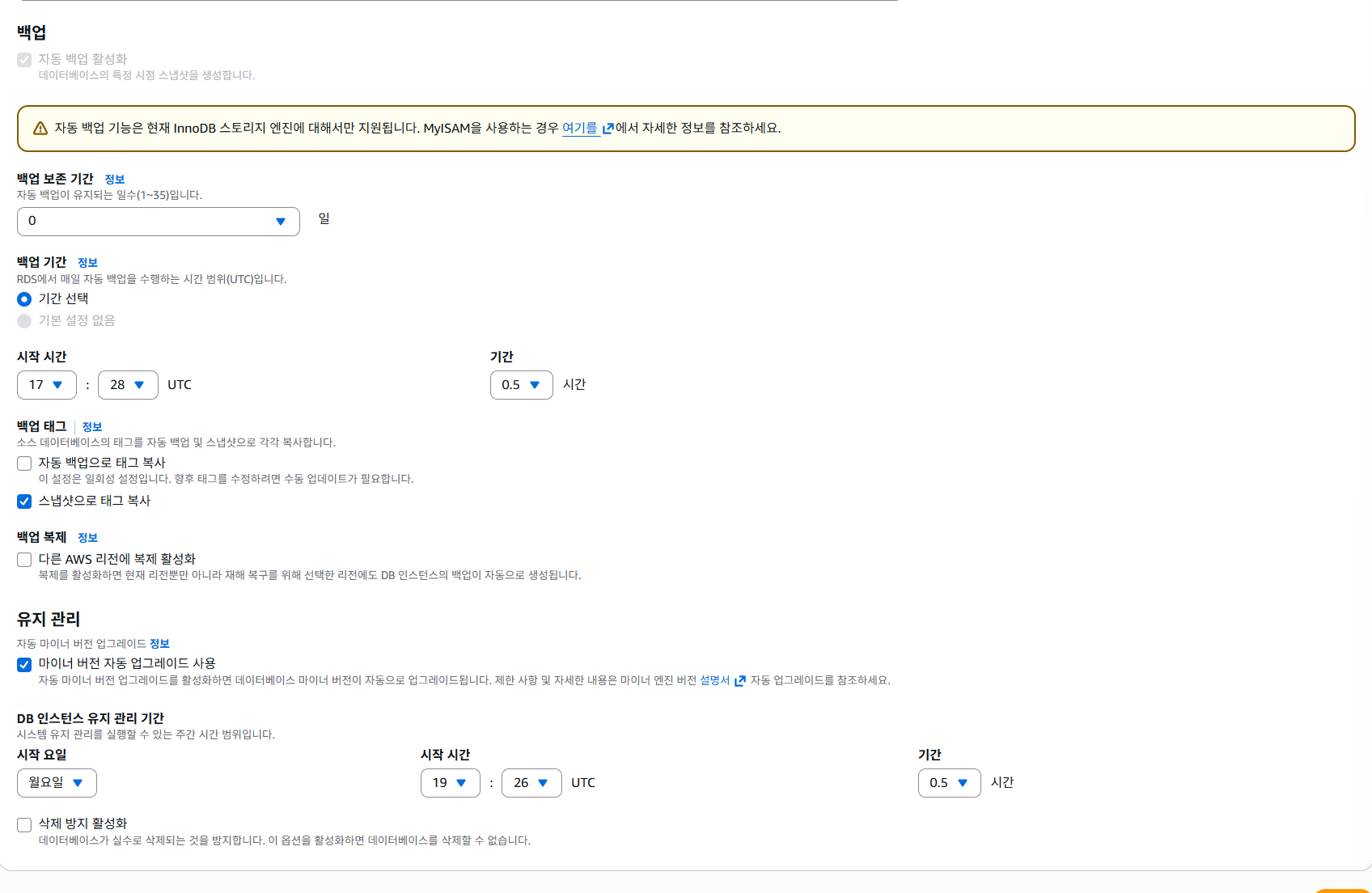 원하는 RDS에서 수정을 들어가 백업을 설정해준다. 나는 활성화는 되어있었는데 보존기간이 0일이라서 이것을 2일로 바꿔주었다.