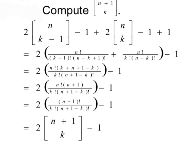 [n k] = n! / (k! * (n - k)!) 로 쓸 수 있다. 고등학교때 4C3 = 3C2 + 3C3 을 배운적이 있는데, 이를 이용하면 다음과 같은 식을 도출할 수 있다.