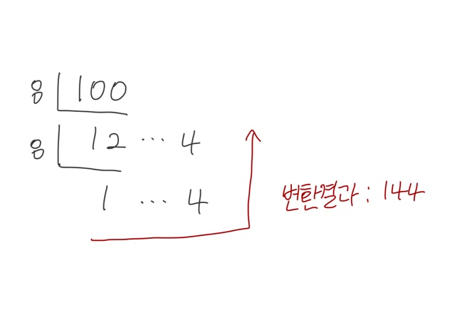 100 나누기 8 -> 몫 : 12, 나머지 : 4 가 된다. 이때 몫을 다시 8로 나누는 과정을 반복한다.