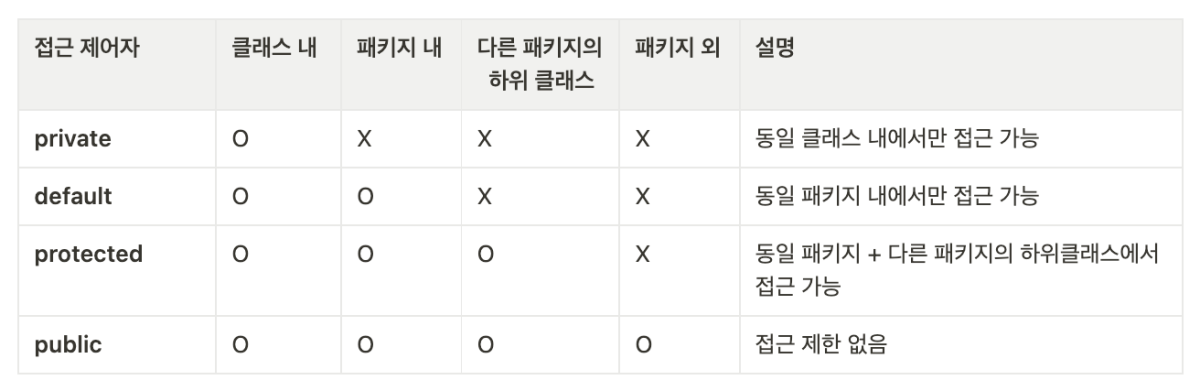 메소드나 클래스앞에 붙이는 접근 제어자인 public, default, protected, private를 이용해 캡슐화를 실현할 수 있다.