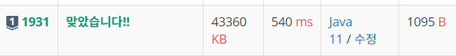 한 개의 회의실이 있는데 이를 사용하고자 하는 N개의 회의에 대하여 회의실 사용표를 만들려고 한다. 각 회의 I에 대해 시작시간과 끝나는 시간이 주어져 있고, 각 회의가 겹치지 않게 하면서 회의실을 사용할 수 있는 회의의 최대 개수를 찾아보자. 단, 회의는 한번 시작하면 중간에 중단될 수 없으며 한 회의가 끝나는 것과 동시에 다음 회의가 시작될 수 있다. 회의의 시작시간과 끝나는 시간이 같을 수도 있다. 이 경우에는 시작하자마자 끝나는 것으로 생각하면 된다.